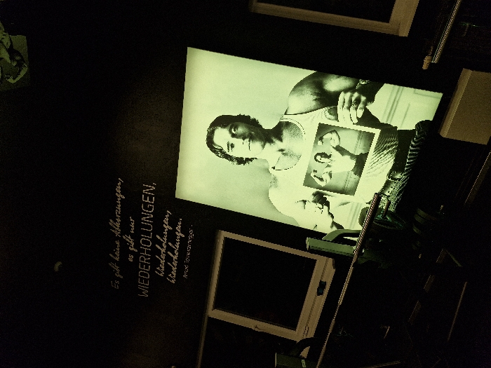 The scene depicts an interior space, likely a fitness-related establishment, located in Oberseelbach, Germany. The environment is dimly lit, featuring dark walls and ceiling, with key elements illuminated by a distinct greenish light. On the upper left wall, a quote is rendered in white script, stating: "Es gibt keine Abkürzungen, es gibt nur WIEDERHOLUNGEN, Wiederholungen, Wiederholungen." attributed to "ARNOLD SCHWARZENEGGER". Below this text, a dark, rectangular opening within a white frame, possibly a window or screen, is partially visible. Centrally positioned, a large, backlit portrait of Arnold Schwarzenegger is prominently displayed. He is depicted from the chest up, wearing a white ribbed tank top, a watch on his left wrist, and a ring on his left hand. He holds a smaller, framed black-and-white photograph against his chest, which shows him posing in a bodybuilder stance, flexing his biceps. In the foreground, a piece of dark-colored gym equipment, consistent with a rowing machine or a component of a weight station, extends horizontally across the lower part of the frame. It exhibits metal rails and what appear to be footrests. To the right of this equipment, a light-colored rectangular object, possibly a stand or base, is present. A partial view of another white-framed opening or display is visible on the far right side of the image.