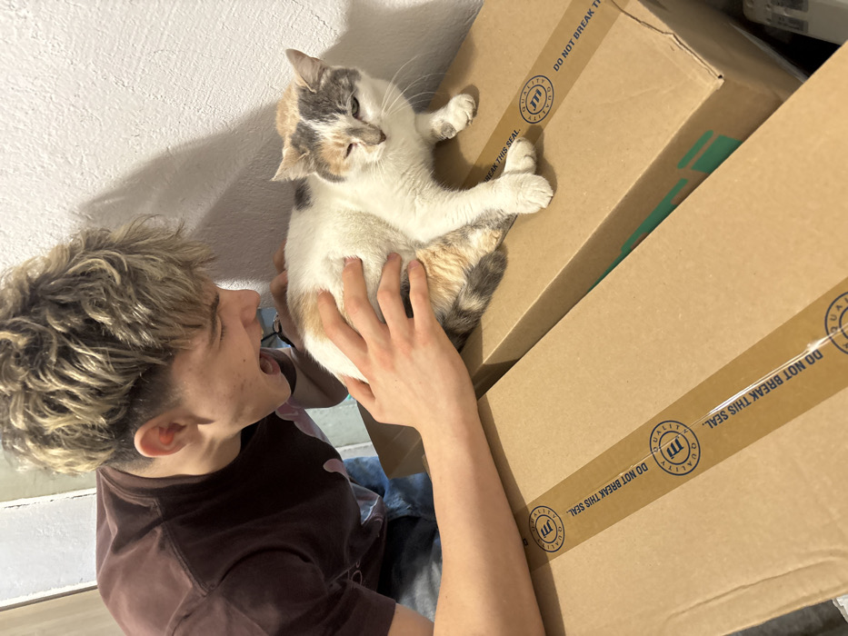 - "An indoor scene in Silistra, Bulgaria, depicts a young male interacting with a domestic cat, likely a calico or tortoiseshell, resting on two stacked cardboard boxes" by FM-pOMy52, licensed under CC BY 4.0
