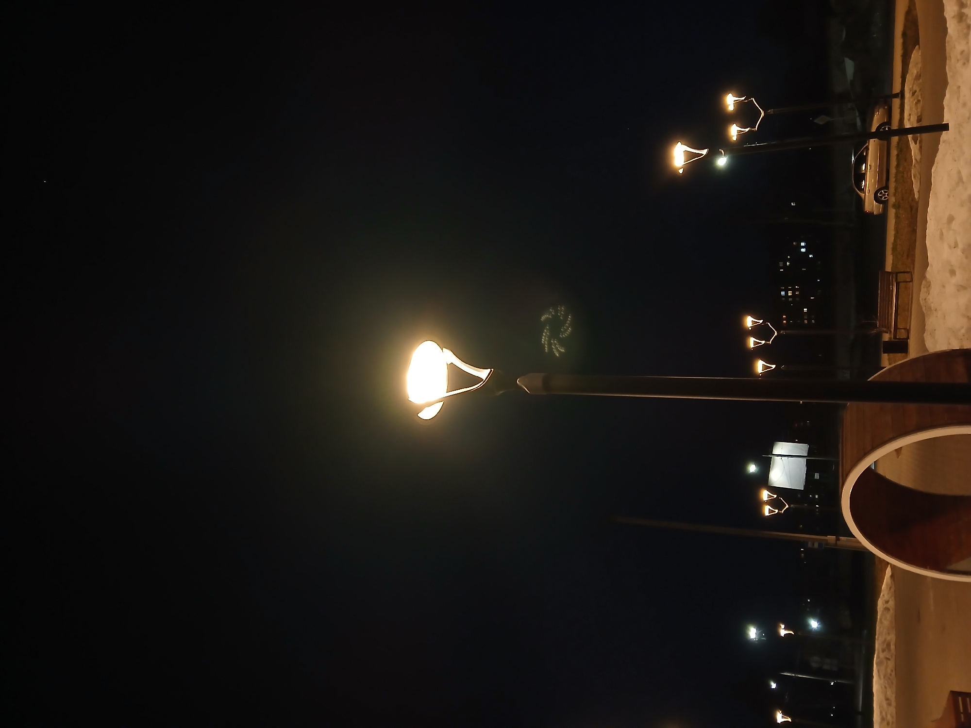 A nighttime scene, likely in a park or public area of Chaikovsky, Russia, is illuminated by several streetlights. The closest streetlight has a curved, modern design. Other streetlights with a more angular design are visible in the background. A bench and a cylindrical structure are also present. There is some snow on the ground near the edge of the frame. A car is parked in the distance. Building lights are also visible in the distance. The sky is dark and clear. There are no people immediately visible in the frame.