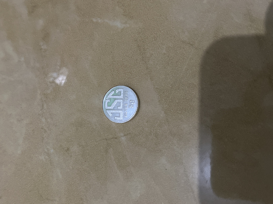 A single circular metallic object rests on a light brown, textured surface within the city of Pulorayeuk, Indonesia. The object, appearing silver-toned, features embossed text: "JSG" prominently displayed at the top, followed by "SILVER 9999" beneath it, and "5g" at the bottom. The surface exhibits subtle variations in color and texture, consistent with a tiled or linoleum floor. Lighting is uneven, casting a dark, undefined shadow in the lower left portion of the image and creating several brighter reflective spots on the surrounding surface. No individuals or other active subjects are present.