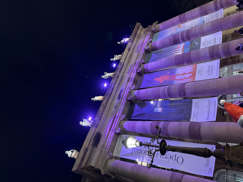 The image displays the illuminated facade of the Opéra National du Rhin in Strasbourg, France, at night