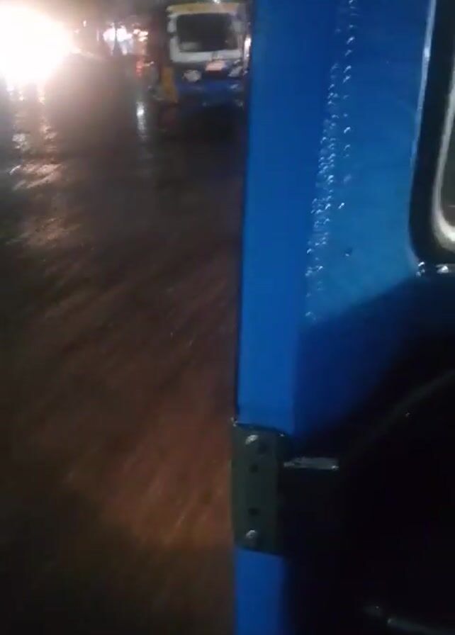 view from inside a blue vehicle, possibly a taxi or auto rickshaw, traveling down a wet street at night. Raindrops are visible on the window. The street is illuminated by headlights from oncoming vehicles and streetlights, which reflect off the wet pavement. Other vehicles are seen in the distance. The view is somewhat obscured by the side of the vehicle and the darkness.