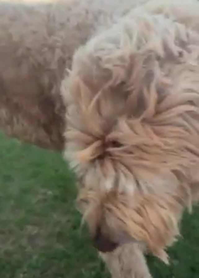 A light-colored, fluffy dog stands on a grassy lawn, its rear towards the camera. It wears a lime green collar. The dog remains stationary for a moment. The backdrop features blurred buildings on the horizon.