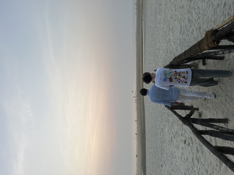 The scene depicts a beach environment in Betalbatim, India, under a sky exhibiting hues of light blue transitioning to pale orange/pink at the horizon. Two individuals are observed walking away from the viewer on a dark, weathered wooden pathway constructed from logs, some wrapped with rope, traversing light-colored sand. The individual on the left, a male, wears a light blue long-sleeved shirt, white trousers, and white shoes. The individual on the right wears a white t-shirt with a multi-colored graphic design featuring palm trees and other elements, and dark green trousers. The pathway terminates on a wide, sandy beach. Beyond this immediate sandy area, a narrow body of water, possibly a stream or tidal inlet, bisects the beach horizontally. Further in the background, across this water, another expansive sandy area extends towards the ocean. Multiple small, indistinct human figures are scattered across this distant beach, with a red flag visible on a pole, possibly indicating a warning or designated area. The ocean surface appears calm, meeting the sky at a flat horizon. The overall lighting suggests either dusk or dawn.