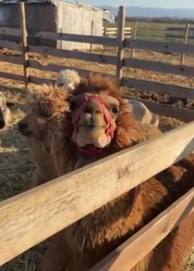 farm scene. First a close-up shows a brown alpaca with a red halter leaning on a wooden fence. Other alpacas are visible in the background within the pen. The camera then pans to the right to show a sheep walking near wooden animal shelters. Finally, the camera shows a group of brown cows eating from a long wooden trough. The weather is sunny and the sky is blue. The ground is covered in straw.