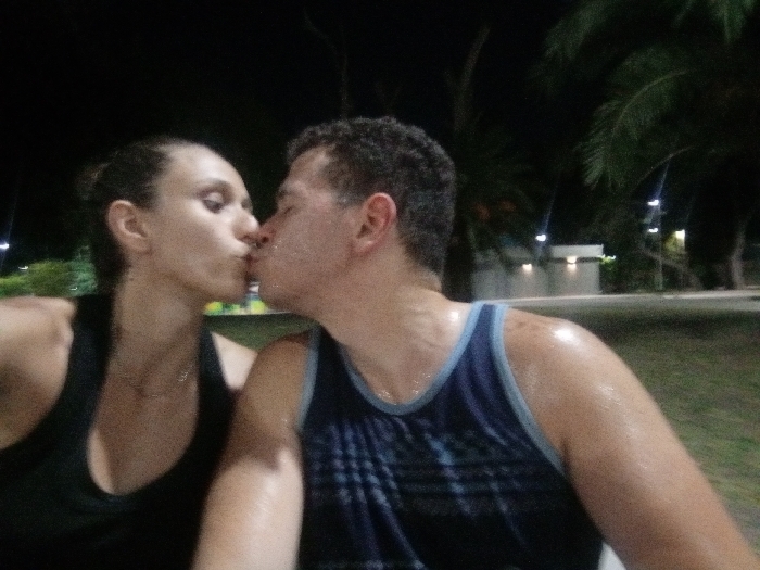 A couple kisses in an outdoor setting at night. The woman wears a black tank top with a silver necklace. The man wears a blue and gray tank top. Both appear sweaty. The background shows palm trees and lights. The lighting suggests it is late in the evening.