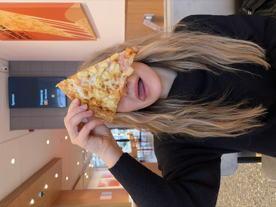 The image depicts a person inside Pizza Bar 1327, located in Podgorica, Montenegro. The central subject is a person with long, wavy blonde hair, wearing a black, textured, high-necked sweater. This individual is holding a triangular slice of Hawaiian pizza in their right hand, covering their right eye and nose, while their tongue is extended from their mouth. The pizza slice features melted cheese, diced ham, and pineapple pieces on a baked crust. The background reveals a modern restaurant interior with light-colored walls, overhead recessed lighting, and light wood ceiling panels. On the left wall, a dark digital display screen shows text in Montenegrin, including "Spremam" (Ready) and "Priprema se" (Preparing), with the number "27" visible. A small white security camera is mounted on the ceiling above this display. On the right wall, a large orange and white graphic poster displays partial text that reads "1327," "VELIKA," and "PICERIJA NA SVETU" (Great Pizzeria in the World). Out-of-focus elements in the deeper background include tables with orange chairs. The floor is a light-colored speckled or terrazzo material. The subject is seated in a chair with a grey upholstered backrest.