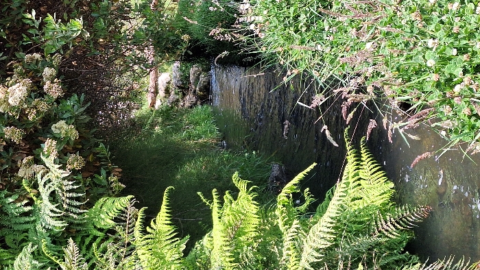 A narrow stream flows between lush vegetation. Ferns dominate the foreground, with assorted grasses and leafy plants along the banks. White flowers bloom amidst the greenery on the left. The water appears dark and somewhat reflective, with stalks of plants occasionally dipping into it. The scene evokes a sense of tranquility and natural beauty.