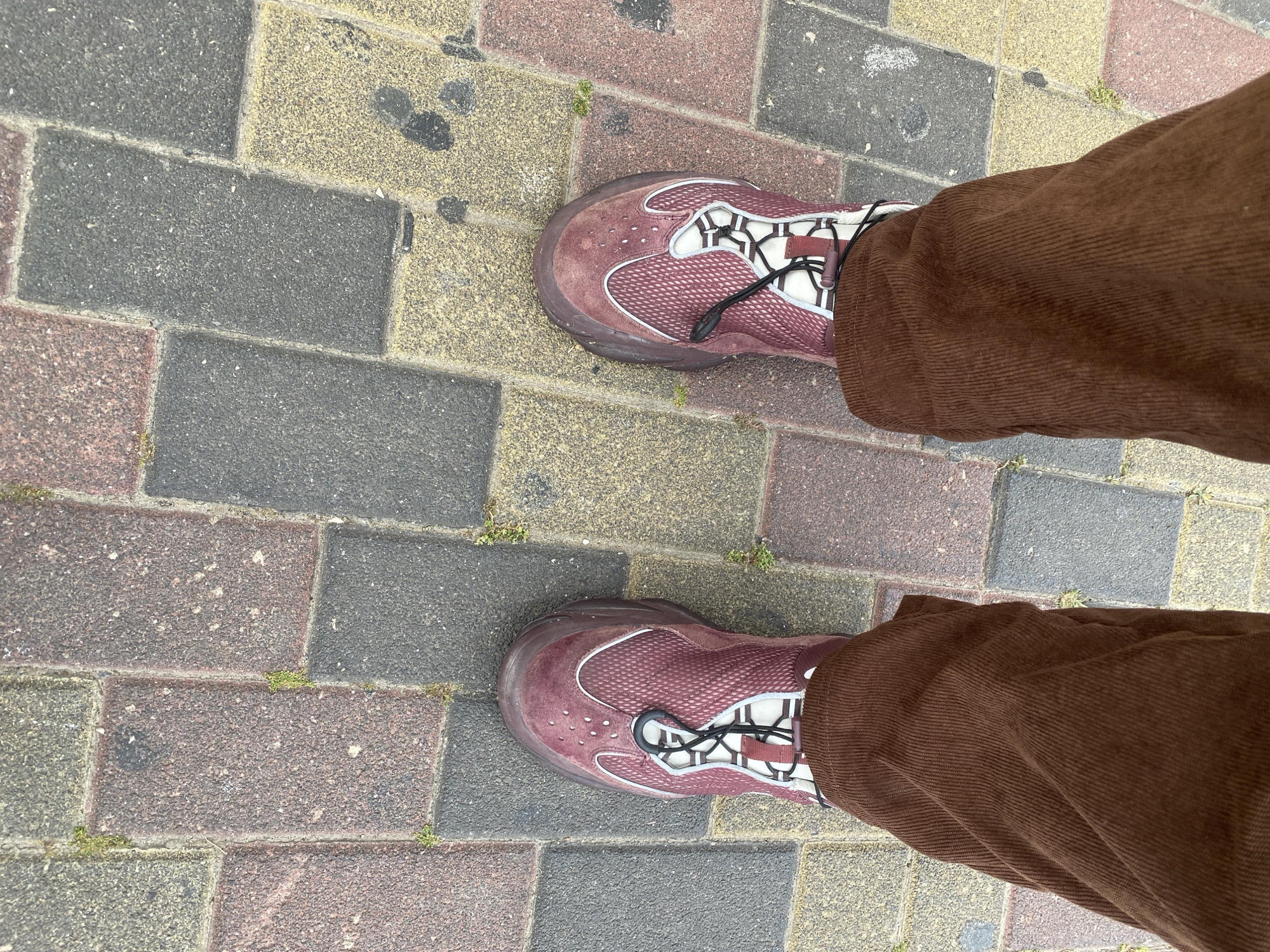 The image displays a top-down view of an individual's lower legs and feet standing on a paved surface in Kiryat Motzkin, Israel. The person is wearing brown corduroy pants and a pair of maroon-colored athletic shoes with mesh paneling, white accents, and black speed laces with a toggle. The footwear exhibits a thick, matching maroon sole. The ground consists of rectangular interlocking pavers in varying shades of dark red, dark gray, and light yellow, arranged in a staggered pattern. The pavement shows signs of wear, including dust, some dark stains, and sporadic growth of small green vegetation within the cracks between the pavers.