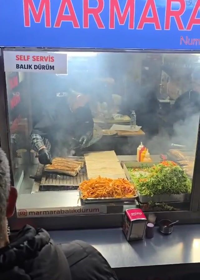 street food stall called "Marmara Balik Durum". A man inside the stall is preparing fish wraps on a grill. He is wearing black gloves and cutting the grilled fish. Next to the grill are stacks of tortillas, a tray of fried onions with sauce, and a container of salad. A customer stands in front of the stall watching the food preparation. The stall is under a blue sign that says "MARMARA" and has a picture of a fish. There is visible steam rising from the grill.