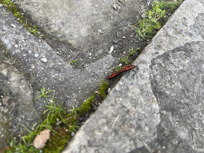 The scene, located in the city of Madara, Bulgaria, presents a close-up, high-angle view of a gray concrete surface. A single red and black firebug (Pyrrhocoris apterus), appearing as two conjoined individuals, is positioned along a narrow, linear crevice in the concrete, oriented horizontally. The crevice contains dark soil, scattered small light-colored pebbles, and patches of green vegetation, including small grass sprouts and moss. A small, dry, light-brown leaf fragment is visible in the lower-left section of the image. The concrete itself exhibits varied textures, minor debris, and some darker, possibly damp, areas.