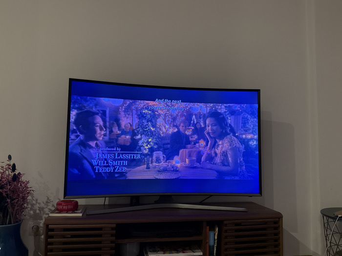A television displays a scene with two people at a table, illuminated by ambient lighting. The credits at the bottom of the screen name James Lassiter, Will Smith, and Teddy Zee as producers. Above the scene, text reads, "And the next you're wondering." The TV is positioned on a wooden cabinet with doors and shelving. A vase with flowers and a small red object labeled "light my lire" are visible on the left side of the cabinet. A side table stands to the right of the cabinet.
