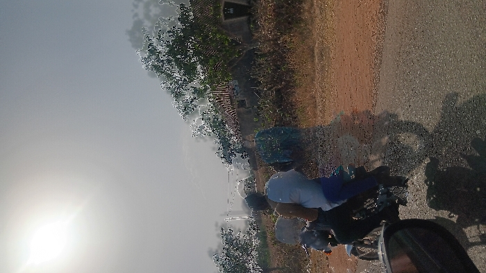 A daytime roadside view features a motorcycle with three people riding, partially visible due to the angle. One person is wearing a white shirt and a blue cap. The motorcycle is on an asphalt road with a dirt shoulder. Faint building or structure with foliage behind. The sky is obscured by a bright sun and possibly haze.