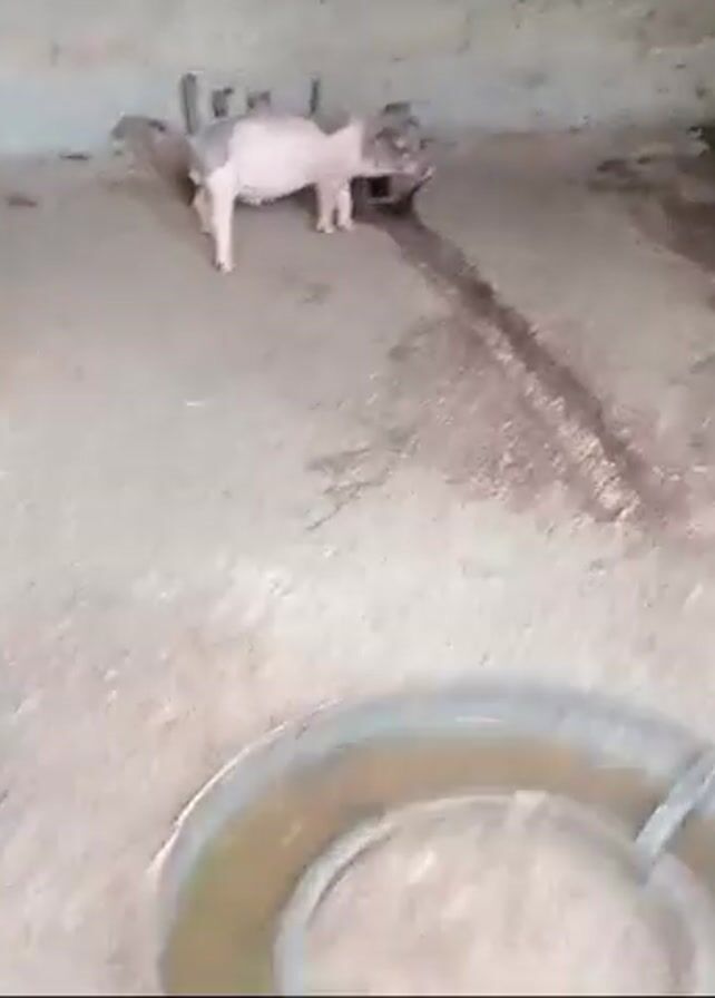 small, pink piglet in a concrete enclosure. The piglet is standing on a concrete floor covered in what appears to be dirt and debris. In the foreground, there is a large, circular metal water trough. To the left of the frame, there is a concrete structure with steps. The walls of the enclosure are made of concrete. The piglet looks towards the camera. A high pitched sound is heard.