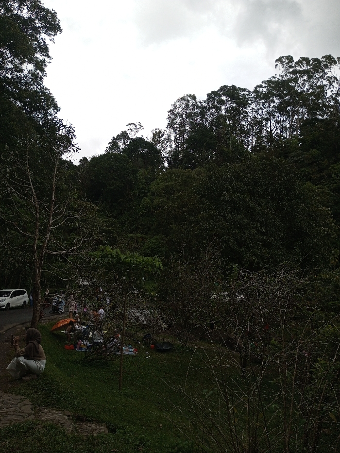A landscape featuring a verdant hillside densely covered with trees under an overcast sky. In the foreground, a person is crouching on a stone path, looking towards a grassy area where several people are gathered, seemingly picnicking. A white car is parked along a road adjacent to the area. The scene is characterized by a mix of natural greenery and human activity.