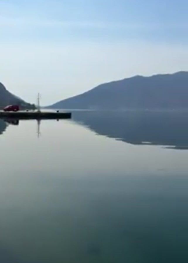 The video depicts a calm body of water reflecting the surrounding landscape. The water is predominantly a muted green color, reflecting the sky and mountains. The sky is a light blue hue, suggesting a clear day. Mountains are visible in the background, with their slopes reflecting on the water's surface. A small dock with a light post and a couple of cars is visible in the distance. The scene is peaceful and serene. A yellow buoy drifts on the water to the right.