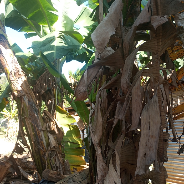 A cluster of banana trees fills the frame. Lush green leaves are abundant on some stalks, while others are draped with layers of dead, brown leaves that have dried and shriveled. The trunks show a rough, textured surface with remnants of old leaf bases. A structure with corrugated metal siding is partially visible behind the trees. The sun creates strong highlights and shadows throughout the foliage.