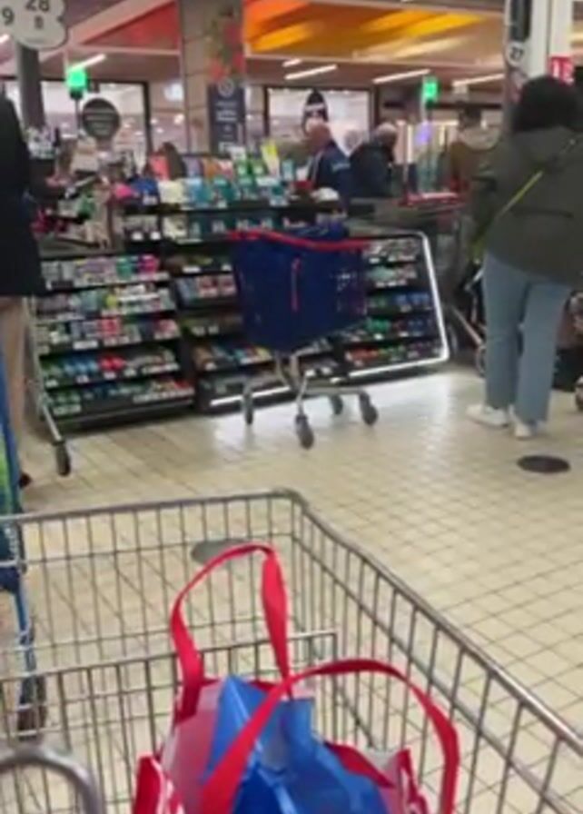 perspective from inside a shopping cart in a supermarket. The cart contains several reusable shopping bags, one blue and one red patterned with white. In front of the cart are other customers waiting in line at self-checkout registers. One customer has a blue Carrefour shopping cart. A man wearing a beanie is at a self-checkout station. Behind him are other customers and at least one stroller. The floors are light-colored checkered tiles. Overhead signs indicate the self-checkout area. Shelves of small items, possibly candy or snacks, are near the checkout area. People are waiting patiently.