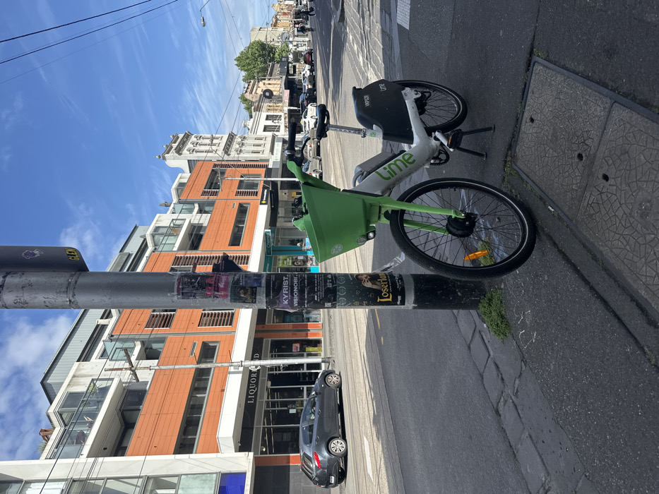 The image displays a daytime street scene in Fitzroy, Australia. In the foreground, a white and green Lime electric bicycle is parked on its kickstand on a concrete sidewalk, positioned to the right of a dark gray utility pole. The bicycle features a green front basket, a front light, the "Lime" logo on its frame, and an alphanumeric identifier "VKP529" on the rear frame. An orange reflector is visible on the front wheel spokes. The prominent utility pole, located slightly left of the image center, is heavily affixed with multiple layered posters and stickers, with fragments of text such as "KYRIST VISIONOBI" and "Loserland" discernible. Small green vegetation grows from the base of the pole. To the right of the bicycle, a section of concrete sidewalk with a square metal utility cover is visible. A paved street with tram tracks in the left lane extends into the background. A dark gray Mazda 2 hatchback is visible in the left lane, positioned in front of a building. Further down the street, multiple vehicles are parked along both sides of the thoroughfare. The background is composed of a mix of urban architecture under a clear blue sky with scattered cirrus clouds. On the left, a multi-story building features modern orange facade panels on its upper levels, incorporating balconies. Its ground level houses commercial establishments, including a "LIQUORLAND" storefront and a partially visible "Commonwealth Bank" sign. Further down the street on the right, several older, ornate Victorian-style buildings with intricate facades are visible, presenting a contrast to the more contemporary structures. Overhead power lines are present above the street. Distant pedestrians are visible on the far sidewalk.