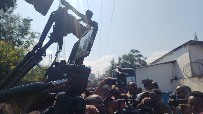This image depicts a crowded outdoor scene in Kabinzi, Rwanda, under a clear, bright blue sky with visible sunlight causing lens flare. The perspective is low-angle, looking upwards and through a dense gathering of individuals. In the immediate foreground, a professional video tripod with an attached smartphone is prominently featured, positioned slightly to the right of the center. The smartphone, dark-colored with visible side buttons, is mounted horizontally, its screen reflecting light. Behind and around this setup, numerous individuals are visible, primarily from the chest up or as disembodied heads. Many are holding up various recording devices, including other smartphones (some mounted on selfie sticks or small tripods) and professional video cameras with attached microphones or accessories. The crowd appears to be intently focused on an unseen subject, with several arms raised, holding devices to capture footage. In the midground and background, an urban or semi-urban environment is present. To the left, green foliage from trees is visible, with hints of yellow flowering plants. Overhead, multiple thin power lines or communication cables stretch across the sky. To the right, a white building with a dark roofline is present, featuring what appears to be razor wire coiled along a wall or fence. Farther back, additional buildings and more distant green trees are discernible under the bright sunlight. The overall impression is a media-heavy event or public gathering.