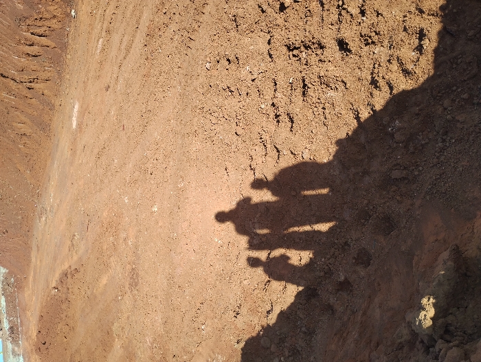 The scene depicts an expansive excavation site in Kikuyu, Kenya, under direct, low-angle sunlight. The environment consists predominantly of disturbed reddish-brown soil, forming irregular mounds, depressions, and elevated embankments. The ground exhibits textured surfaces, including potential tire tracks or indentations in the mid-ground. In the immediate foreground, the elongated shadows of four human figures are cast onto a steep, textured slope of loose earth. Three distinct human-shaped shadows are grouped together: a central, taller figure flanked by two shorter figures. The fourth shadow, belonging to the photographer, is partially visible at the bottom edge of the frame. No specific objects or active behaviors are discernible beyond the static presence indicated by the shadows and the altered terrain.