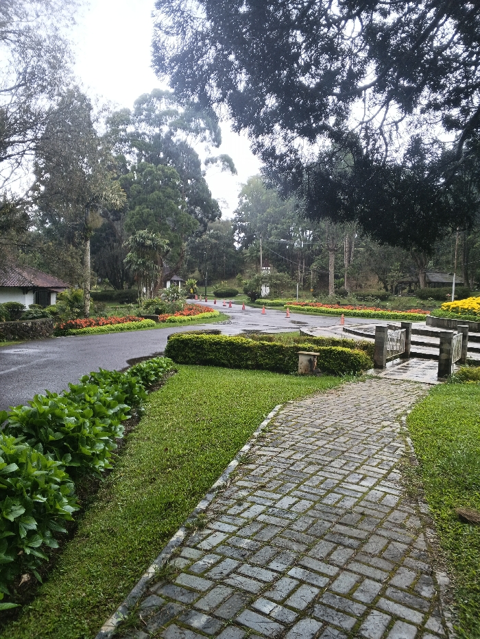 This image depicts a cultivated park or garden area within Matopos, Zimbabwe. No individuals, vehicles, or animals are present. The scene appears damp, consistent with recent precipitation. In the foreground, a curved pedestrian walkway composed of grey rectangular pavers, laid in a herringbone pattern, extends from the lower center toward the mid-right. This path is bordered by strips of green grass. To the left of the path's grass border, a dense row of large-leafed green plants is observed. To the right of the walkway, beyond a grassy section, a raised concrete platform with short railings is visible, its surface reflective of moisture. The midground features a dark asphalt road curving from the lower-left towards the upper-center. This road is edged by meticulously maintained garden beds containing green shrubs and vibrant orange-red flowering plants. Approximately five orange traffic cones are positioned along the road's edge, particularly around a bend. A central, circular grassy area, enclosed by a low, trimmed green hedge, is also present and appears wet. A white building with a dark roof is partially obscured by trees on the far left. A bed of yellow flowers is visible further along the right side of the road. The background is characterized by a dense assortment of tall trees with varied green foliage. An overcast sky is visible through breaks in the overhead tree canopy.