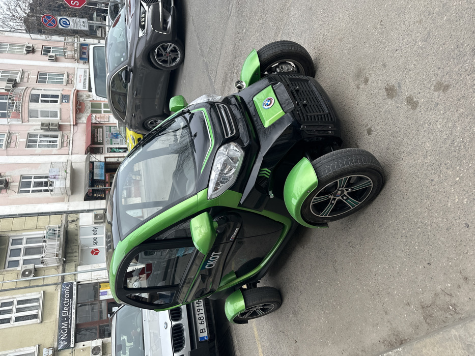 - "An urban street scene in Varna, Bulgaria, features a black and bright green three-wheeled enclosed microcar parked on asphalt pavement in the foreground, angled towards the right" by FM-kvwHa2, licensed under CC BY 4.0