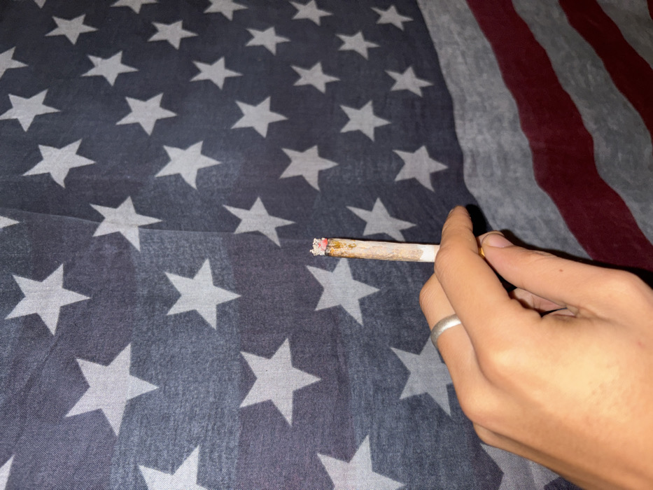 A light-skinned hand, with a silver-colored ring on the ring finger, holds a lit, partially consumed rolled paper cylinder, likely a cigarette or joint. The item exhibits a glowing orange ember and white ash at its tip, with a yellowish residue visible on the paper near the burning end, and a white filter. The hand grips the item between the thumb and index finger. The background is composed of a draped fabric patterned to resemble the American flag, featuring a dark blue field with white five-pointed stars across the upper portion, transitioning to red and white stripes in the lower right. The specific location within the city of Tangier, Morocco, cannot be determined from the visual evidence presented in this image.