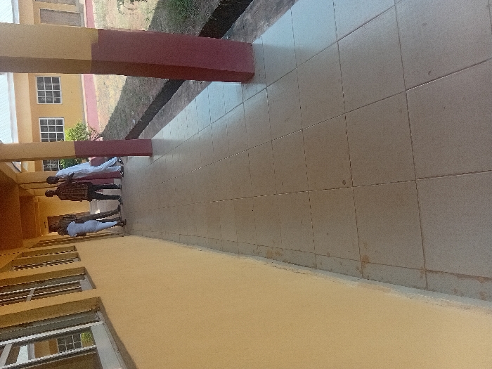 The scene depicts a covered outdoor walkway of a building located in Ayangba, Nigeria