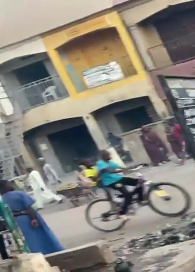street scene in what appears to be a developing country. There are people walking on the street, some in traditional clothing. A yellow and blue three-wheeled vehicle called a "Keke" is driving on the street. There is also a person on a bicycle. A man in camouflage pants and black shirt is walking on the street holding a weapon in his right hand. There is a building with a sign that says "MTN" on it. There is a sign with writing on it that is difficult to read. A loud noise is heard, similar to a siren.