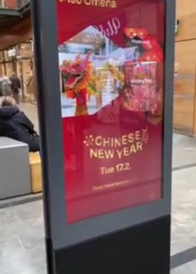 interior of a shopping center. First, the camera is focused on a large digital advertising display with a red background, promoting Chinese New Year celebrations at Iso Omena on Tuesday, February 17th, with images of a dragon dance, photo wall, and wishing tree. The brand name "OCEAN" is visible at the top right corner. The camera then pans to the right, revealing the shopping center's walkway, before returning focus to the digital display. Following this, the camera is directed towards the entrance of a pharmacy called "Ison Omenan Apteekki," which is in Finnish, identifiable by its green and white signage and the presence of customers inside. The pharmacy's entrance also features the words "KASSA CASH DESK," indicating the location of the cash registers. The floor is tiled with gray, and there are people walking in the background.