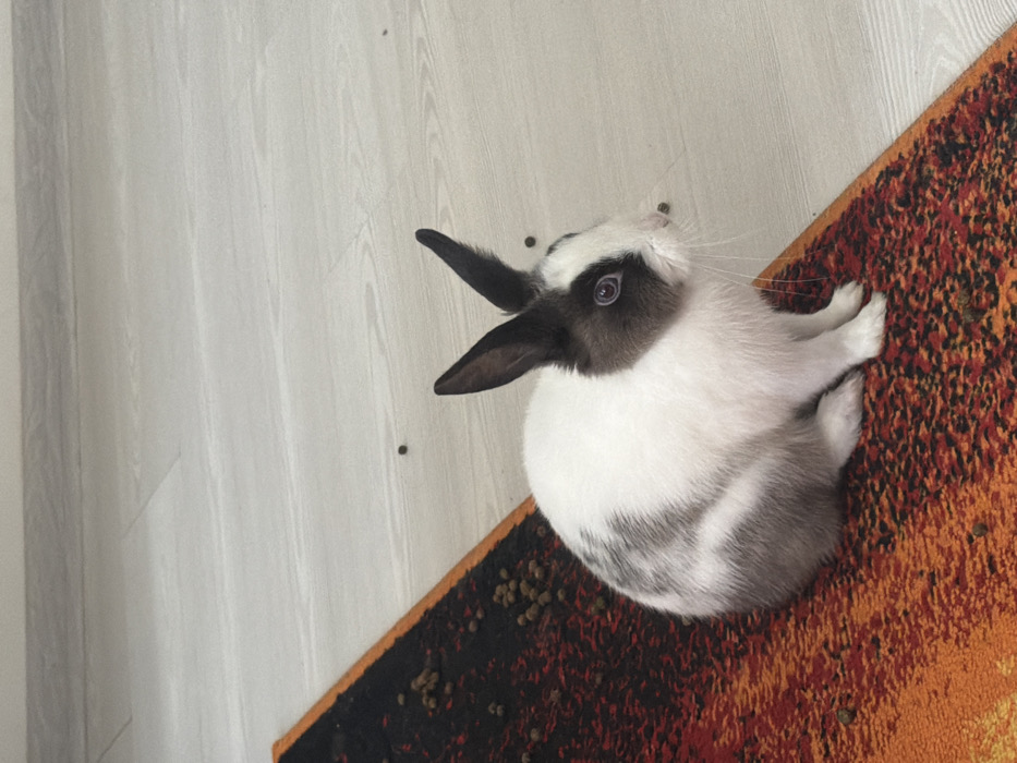 - "A bi-colored domestic rabbit is depicted sitting indoors on a textured orange and black patterned rug" by FM-8mqz02, licensed under CC BY 4.0