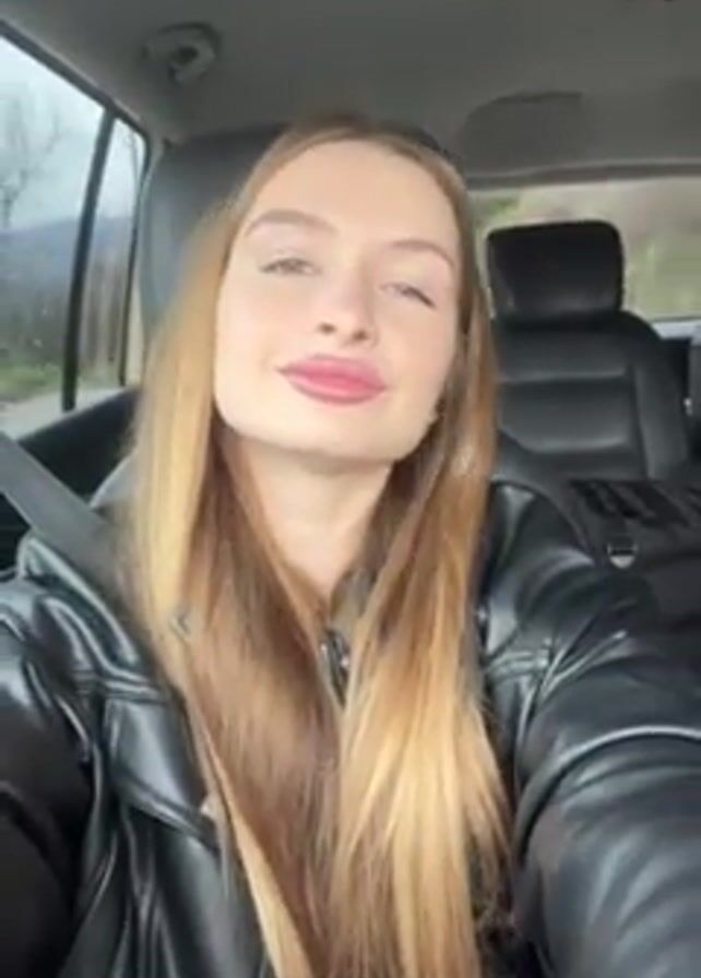 A young woman with long, light brown hair is sitting in the driver's seat of a car. She is wearing a black leather jacket and a seatbelt. The car's interior is visible, with black leather seats and a dashboard. The background shows a blurred view through the car window, suggesting the car is moving. The woman looks directly at the camera, occasionally slightly tilting her head, and offers a subtle smile. The lighting is soft and natural.