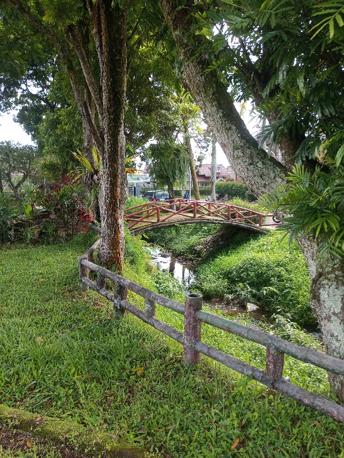 A serene park scene features a quaint red bridge arching over a small stream. Lush greenery fills the landscape, with trees towering overhead and a fence line marking the foreground. Houses and cars are visible in the distance, suggesting a nearby residential area. The lighting is soft, casting gentle shadows on the grass and the bridge, creating a tranquil atmosphere.