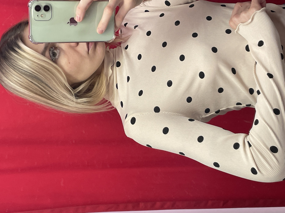 A blonde female is depicted from the upper torso, capturing a mirror selfie within a fitting room in Moscow, Russia. She possesses short, straight blonde hair and wears a cream-colored, ribbed, long-sleeved turtleneck shirt patterned with black polka dots. White mascara is visibly applied to the lower lash line of her left eye. Her right hand holds a light green iPhone 11 in a clear protective case, obscuring the right side of her face and partially revealing the phone's Apple logo. Her left arm is bent, with the hand resting near her waist. The background consists of a red fabric curtain, exhibiting minor folds and a subtle lighter vertical edge on the far left.