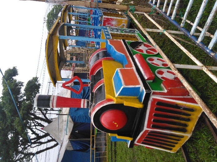 - "The image displays a stationary, brightly colored kiddie train ride positioned on metal tracks over green grass in Ciwalen, Indonesia" by FM-lcyaM2, licensed under CC BY 4.0