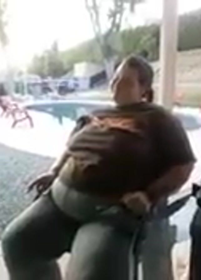 A woman is seated outdoors, likely on a patio, with a swimming pool and lounge chairs visible in the background. The woman has short brown hair and is wearing a dark T-shirt and light-colored pants. She appears to be speaking and holding a cigarette. A large black object, possibly a cooler or container, is to her right. The scene is bright and sunny.
