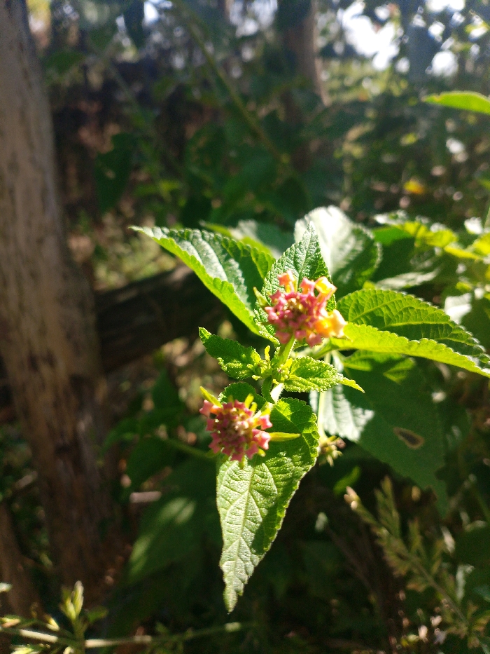 Lush green leaves, textured with prominent veins, dominate the frame. Delicate clusters of tiny flowers, a mix of pink, red, and yellow hues, emerge from the foliage. A rough-textured, light brown tree trunk appears blurred in the background, partially obscured by the leaves. Sunlight dapples the scene, creating highlights and shadows on the leaves and flowers. The background is a mix of green foliage and branches.