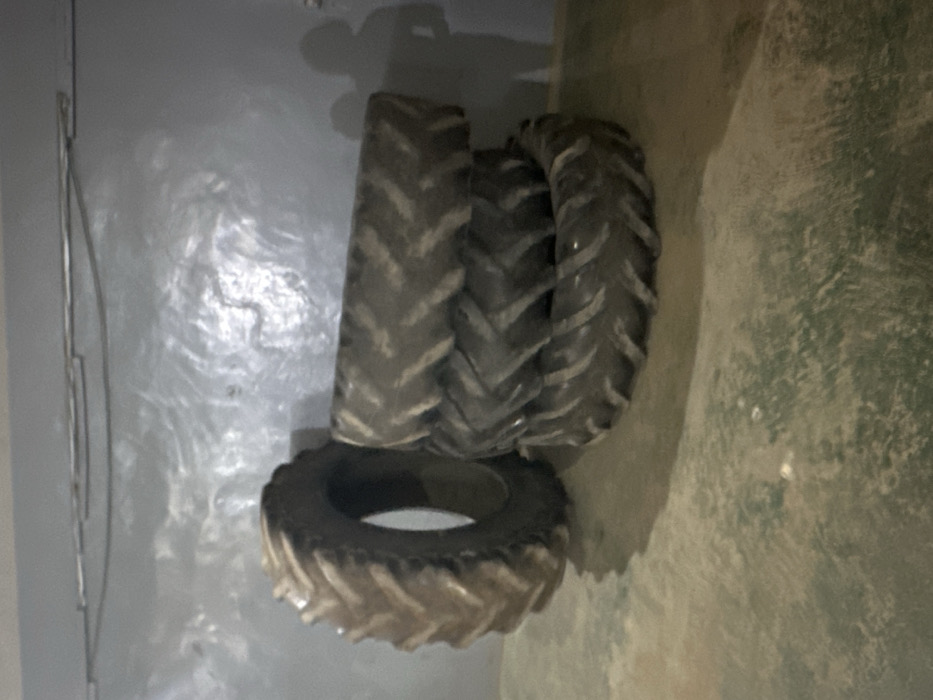 four tractor tires in a garage or storage area. Three tires are stacked upright, while one lies horizontally. The tires have a distinctive tread pattern designed for off-road traction. The background is a mix of concrete walls and flooring, showing signs of wear and dirt. A metal rod is on the left side of the image.