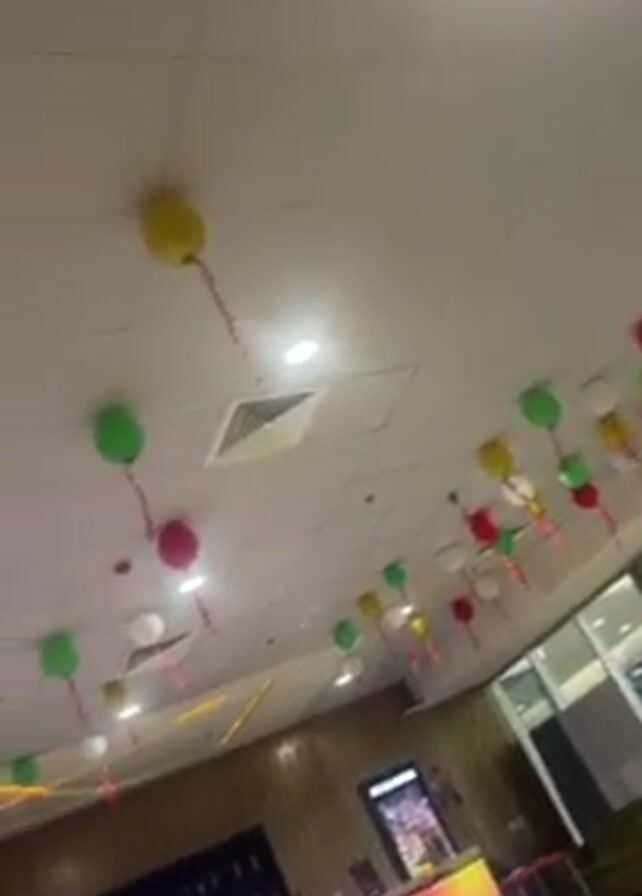 interior of what appears to be a movie theater lobby. The ceiling is white with fluorescent lights and decorated with red, green, yellow and white balloons. The walls are a dark brown color and there are several digital screens displaying movie information. In the foreground, there are several people standing near a concession stand with promotional signage. A decorated Christmas tree and presents are visible next to a red pillar.