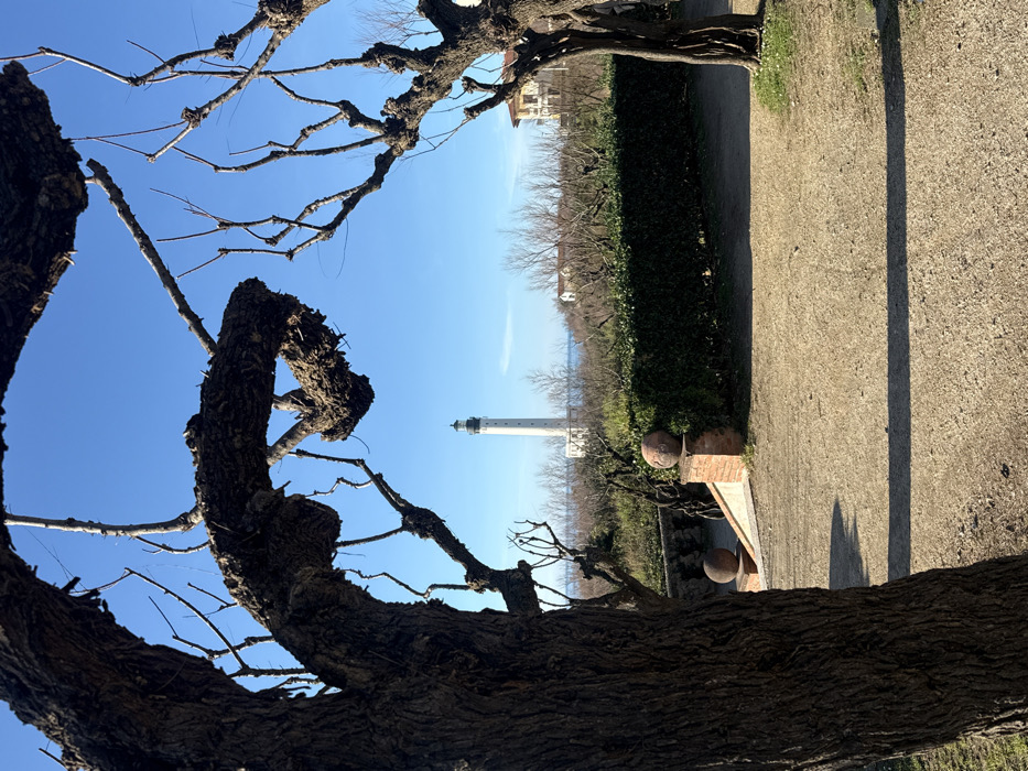 The image displays a panoramic view of the Phare de Biarritz lighthouse in Biarritz, France, under a clear blue sky. In the foreground, two large, gnarled trees with rough bark and bare branches partially frame the scene, obscuring the upper left and right corners. The ground surface is composed of light brown, coarse earth or gravel, exhibiting distinct, elongated shadows cast from left to right, indicating strong sunlight. To the immediate left, a short brick structure with a rounded, dark terracotta-colored finial is visible, marking the upper section of a stone staircase descending out of view. A second, similar sphere is observed lower on the steps. A neatly trimmed, dense dark green hedge extends horizontally across the midground. Beyond the hedge, a line of deciduous trees and shrubs with bare branches occupies the landscape. The Phare de Biarritz, a tall, slender white cylindrical lighthouse with a prominent dark lantern room at its apex, stands centrally in the background. A horizontal segment of blue ocean is visible directly behind the lighthouse and vegetation. To the right of the lighthouse, a light-colored building with a reddish-brown roof is partially visible amidst the bare trees. No human figures are present in the scene.
