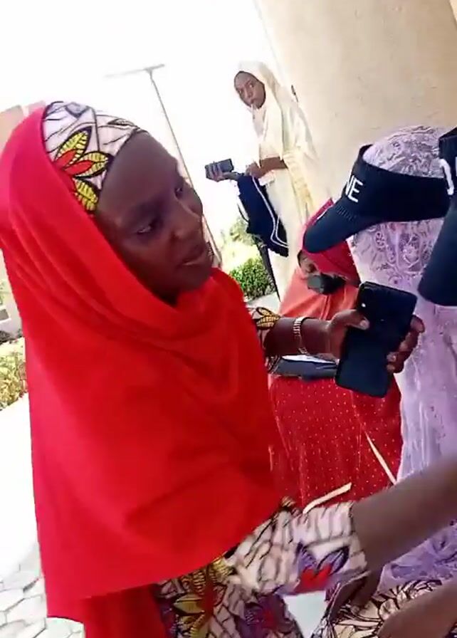 several women, one of whom is wearing a red hijab, as they stand in an outdoor area. The woman in the red hijab appears to be talking to someone off-camera, and then turns to walk down the sidewalk. The sidewalk is made of hexagonal gray tiles. In the background, there is a building with many windows and a number of people milling about.