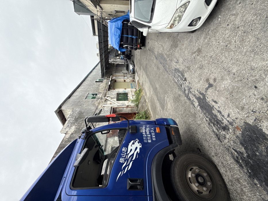 The image depicts an industrial alleyway under an overcast sky, likely situated within or on the periphery of Guangzhou City, China. In the foreground left, a blue box truck is partially visible, displaying "佛山市" (Foshan City) along with a white tiger head and flame graphic, and Chinese characters indicating a total mass of 4495kg, load mass of 1495kg, and approved capacity for 3 persons. To the foreground right, the front quarter and headlight of a white sedan are visible. The concrete pavement between these vehicles exhibits dark, irregular streaks. Down the alley, a silver sedan is parked. Further beyond, a second truck, possibly a flatbed, is parked with a load of black cylindrical objects covered by a blue tarp. Two indistinct human figures are visible near this second truck. The left side of the alley is bordered by a weathered, multi-story grey building featuring multiple windows and two roll-down metal doors, one of which appears rusty and partially open. The right side of the alley includes another building and a metal canopy structure.
