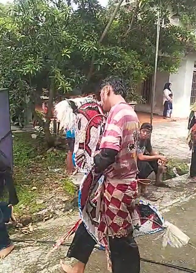 man in a checkered shirt performing a traditional dance, possibly jaranan, on a concrete surface outdoors