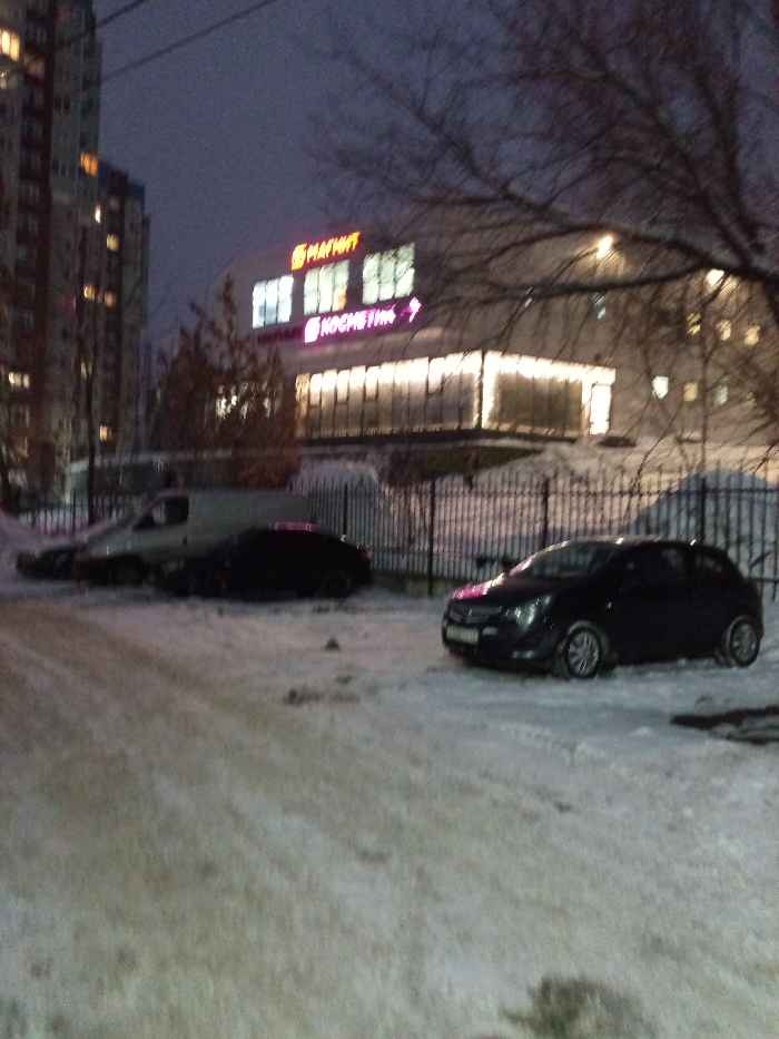 An outdoor evening scene shows a snow-covered ground and several parked vehicles. A light-colored van is parked behind a black car, and another black car is parked closer to the viewer. A building with lit windows and signs, including "Магнит" (Magnit) and "Косметика" (Cosmetics), is visible in the background. Bare trees and a fence are also present. A tall residential building can be seen on the left. The lighting suggests it is dusk or night.