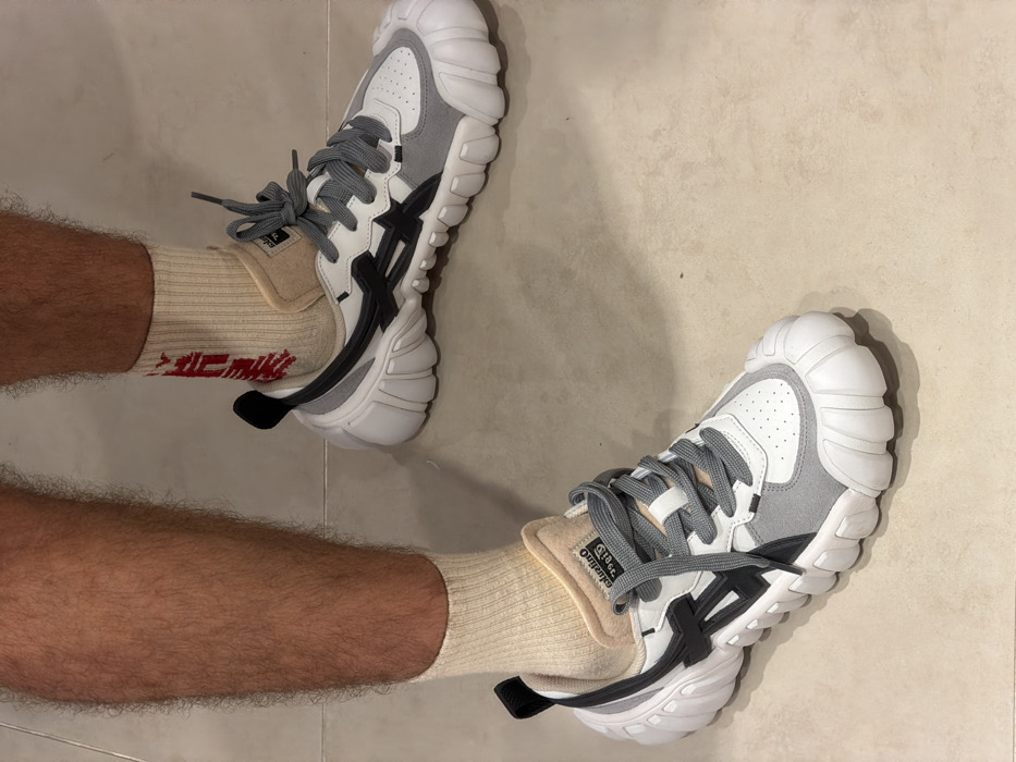 Two human legs, covered in brown hair, are depicted from the mid-calf down, standing on a light beige tiled floor. Both feet wear cream-colored, ribbed ankle socks and identical Onitsuka Tiger sneakers. The sneakers are multi-toned, featuring white and light grey panels, black Onitsuka Tiger stripes on the sides, grey laces, and a prominent, segmented white sole with a bulbous toe cap. A partial, distressed red graphic is visible on the right sock. The indoor environment consists of square floor tiles with visible grout lines. The specific location within Kuala Lumpur, Malaysia, is not discernible from the image.