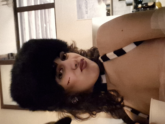 The image displays a head-and-shoulders portrait of a female subject, positioned centrally and looking directly at the camera. She wears a large, black, furry ushanka-style hat that covers most of her dark, curly hair. Her face features dark lipstick and a simulated diagonal red scar on her left cheek. She is adorned with a black and white striped choker and a light-colored garment exposing her shoulders and upper chest. Her expression is a subtle smirk. A portion of a white cup is visible in the lower-left corner of the frame, held in her left hand. The background indicates an indoor setting with light-colored walls, wooden architectural framing, and a partially visible poster or sign on the right, which distinctly displays the word "FRANCE". Below this sign, blurred bottles and other objects are visible on what appears to be a counter or shelf. The scene is located in the city of Paris, France.