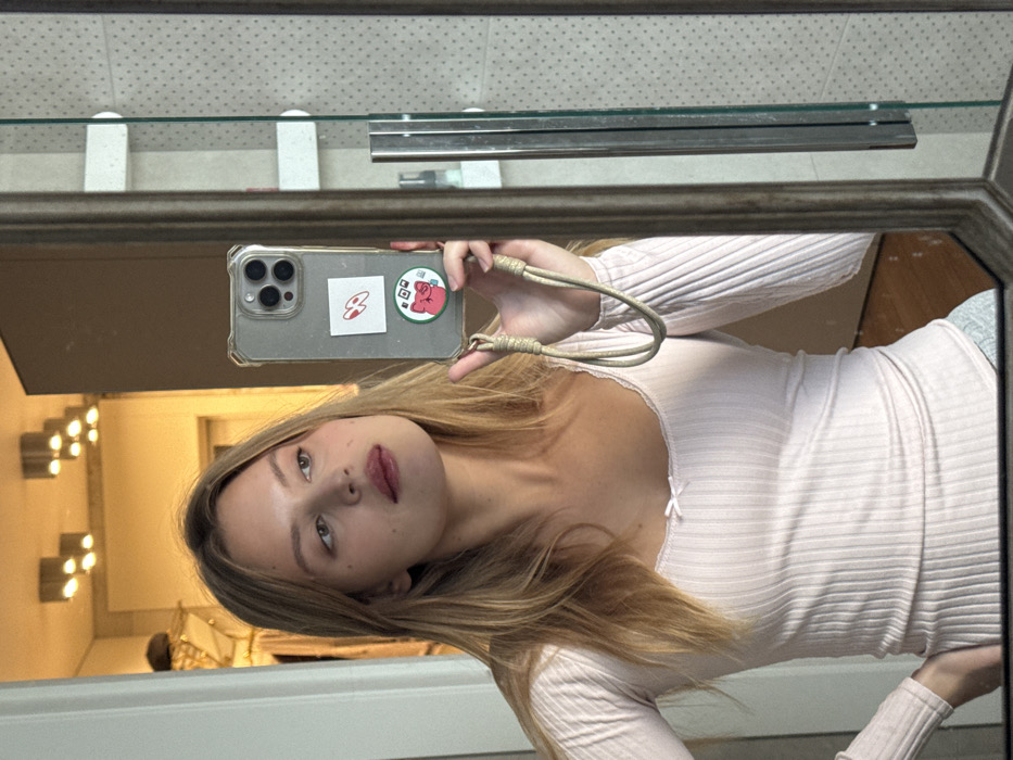 A young adult female is depicted taking a mirror selfie in an interior setting, identified as Hrodna, Belarus. The subject, with long blonde hair and light makeup, wears a light pink, long-sleeved, ribbed top with a scoop neckline and a small white bow. She is holding a clear-cased iPhone in her right hand, which features a light tan braided lanyard and two stickers: one white with a red abstract design, and another green circular sticker with a pink pig character adorned with playing cards. Her reflection captures a room with warm overhead lighting fixtures. To her left, a doorway leads to an area containing a clothing rack with garments. To her right, a glass shower partition with a metallic frame is visible, beyond which a patterned wall and some toiletries on a shelf are reflected.
