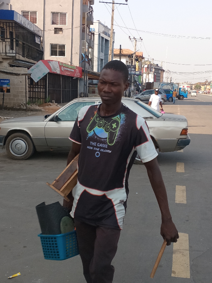A man walks on a street carrying a blue basket with dark items, a wooden frame, and a stick. He wears a black shirt with a white trim and a video game controller design. A tan-colored car is parked behind him. In the background are buildings, a street with other vehicles, and several people, one wearing white. The sky is bright and hazy.