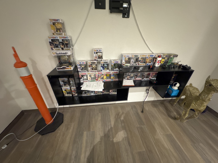 The scene depicts an interior room in San Bernardino Tlaxcalancingo, Mexico, featuring a light-colored wall and light brown wood-look laminate flooring. A black, multi-tiered shelf unit spans approximately two-thirds of the wall's width, primarily housing numerous Funko Pop! figures in their original packaging, arranged vertically and horizontally. On the top surface of the shelf's right side, a white bottle with a red cap, several small green toy vehicles, and a black remote control are visible. A white piece of paper with text lies on a lower shelf, and a blue box containing a white spherical device is positioned in a lower-right cubby. A black wall-mounted bracket with a grey wire extends downwards from the upper center of the wall. To the left of the shelf unit, an orange and silver cylindrical object, resembling a traffic cone, stands on a black hexagonal base. A white power cord extends from this base along the floor. To the right of the shelf unit, a large, glittery gold, wire-frame sculpture of a quadrupedal animal, likely a deer, rests on the floor. No individuals are present in the static scene.